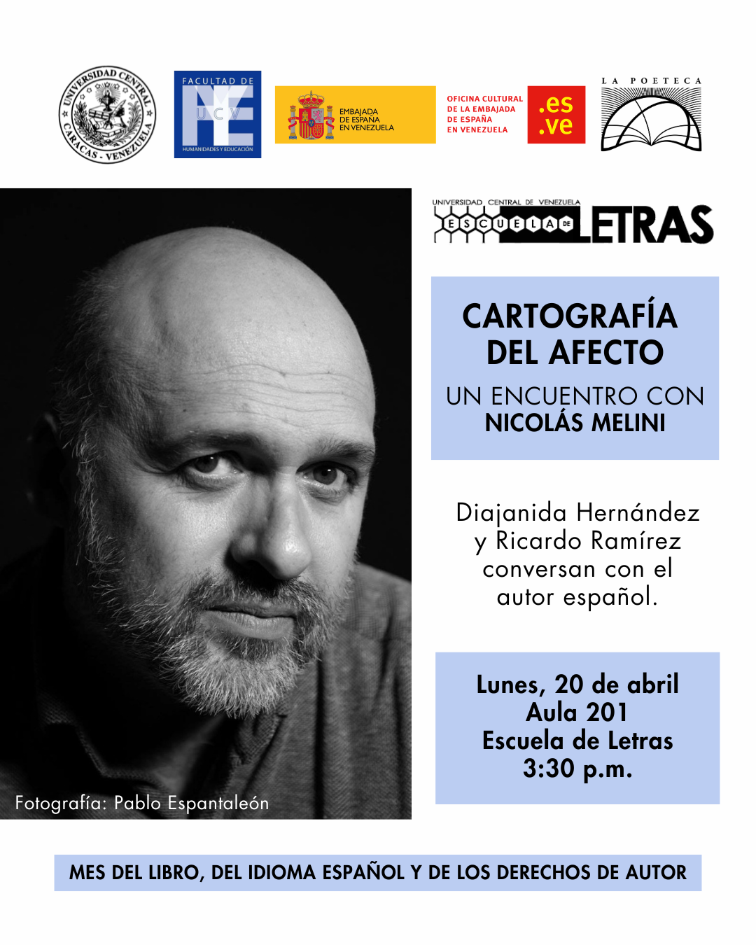 Este #20Abr intervendrá en “Cartografía del afecto”, que se llevará a cabo a las 3:30 p. m. en la Escuela de Letras de la Universidad Central de Venezuela (@ucvnoticias). Allí lo acompañarán Diajanida Hernández, gestora cultural y profesora de Teoría Literaria en esa institución, y Ricardo Ramírez, escritor y director de @lapoeteca.